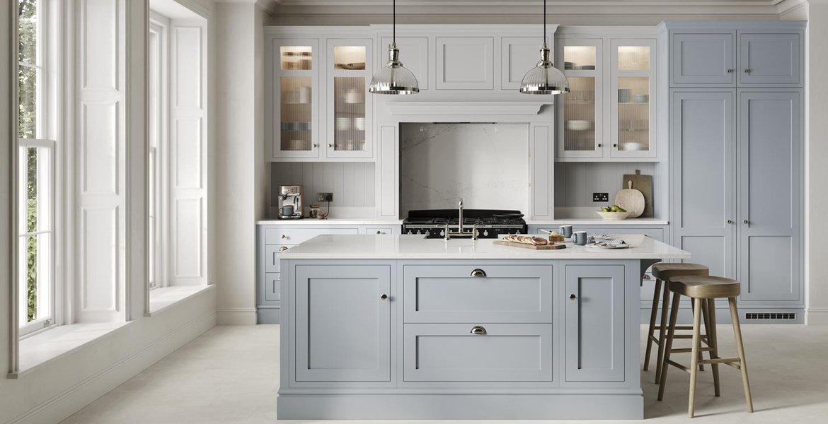 The Powder Blue Manor Kitchen blends classic British craftsmanship with a soft contemporary colour palette, creating a space that feels graceful, bright and timeless. Painted in a gentle powder blue with subtle grey undertones, the cabinetry introduces a calm and soothing atmosphere while maintaining an elevated, heritage-inspired aesthetic.