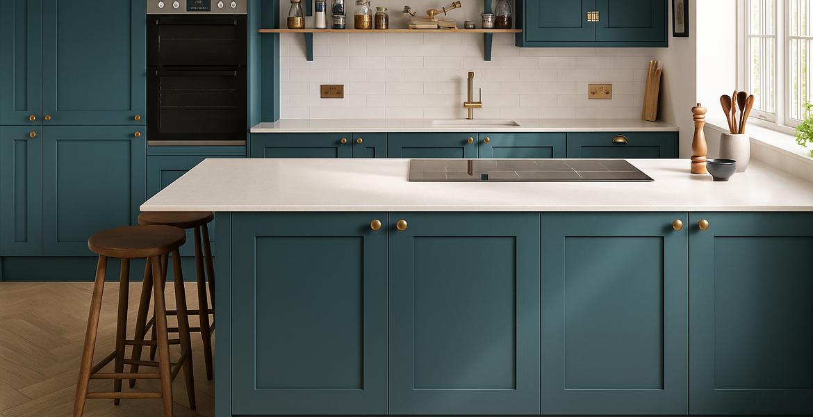 Ocean Mist Shaker Kitchen captures the refreshing essence of coastal-inspired design. Featuring deep teal shaker cabinetry paired with warm brass hardware, this kitchen creates a serene yet luxurious atmosphere.